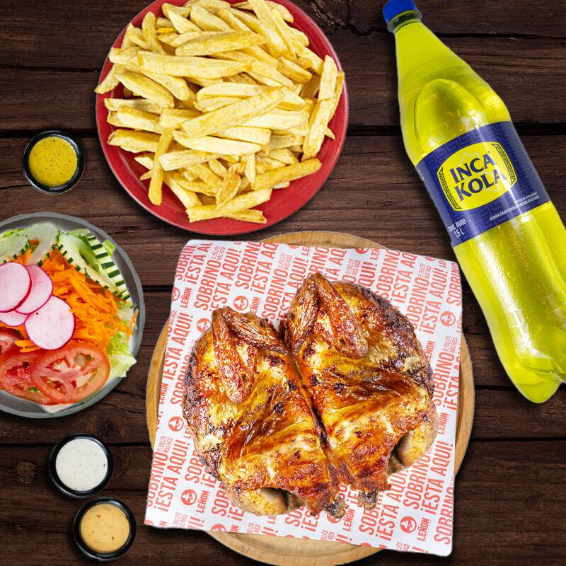 1 Pollo a la brasa acompañado de abundantes papas fritas, crema y gaseosa de 1.5L.