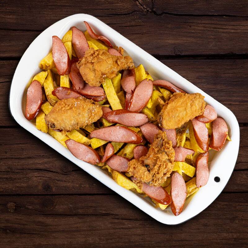 Salchipapa de la casa, contiene 1/8 de pollo, hot dog, chorizo, papas fritas y huevo.