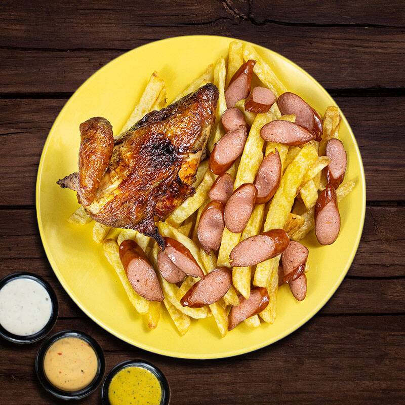 Nuestro tradicional 1/4 de pollo con papas fritas, acompañado de hot dog ahumado.