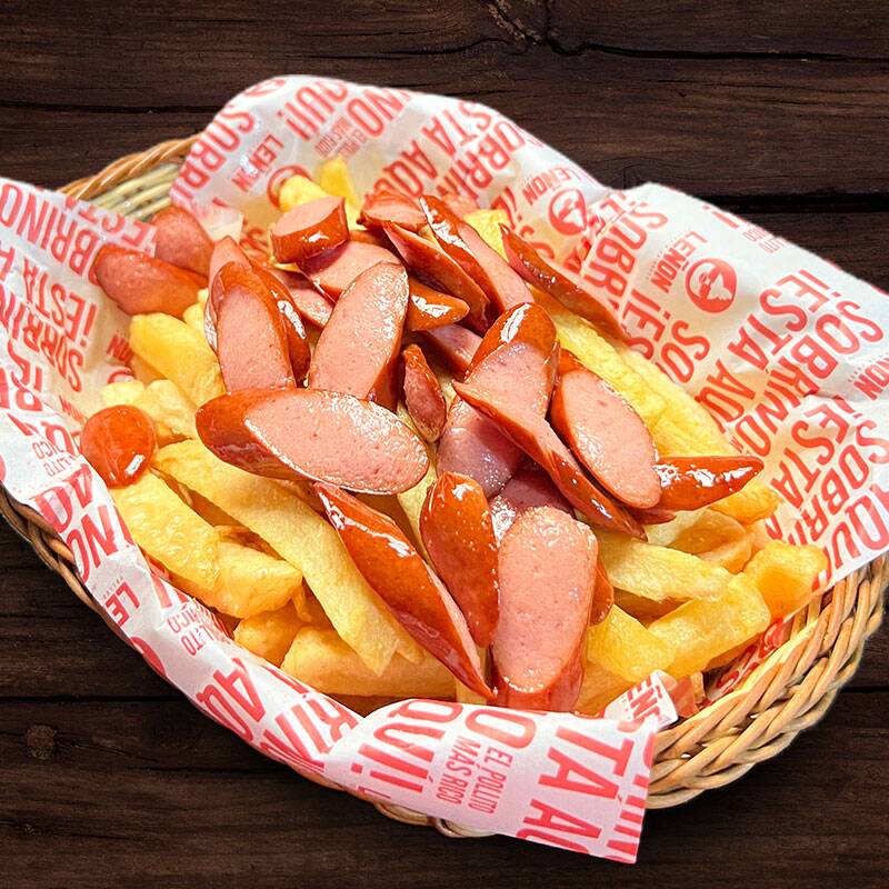 Trozos de hot dog ahumado, abundantes papas fritas y 2 cremas a elegir.