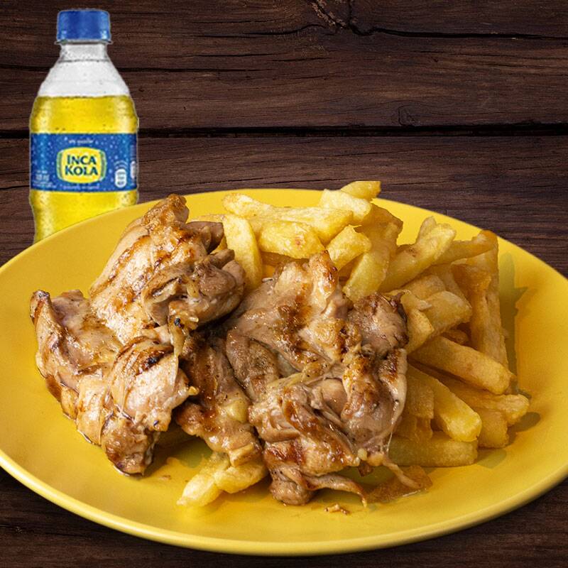Deliciosa pierna a la parrilla más papas fritas con gaseosa (inca kola o coca cola) de 300 ml