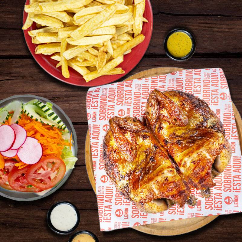 1/2 Pollo a la brasa acompañado de crocantes papas fritas, ensalada fresca y cremas.