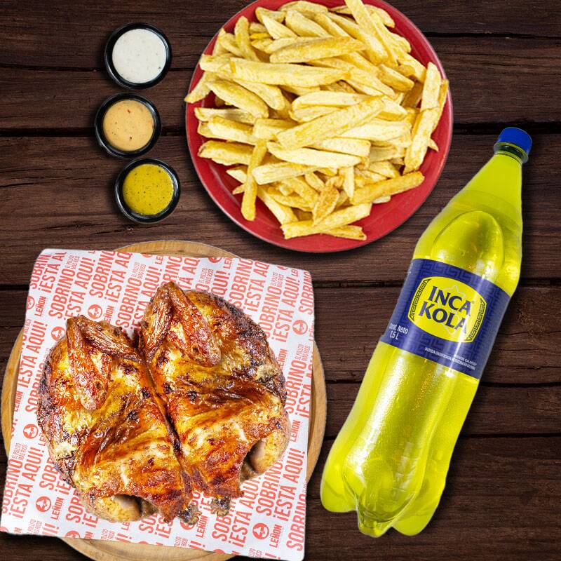 1 Pollo a la brasa acompañado de abundantes papas fritas, crema y una inca kola 1.5 L.