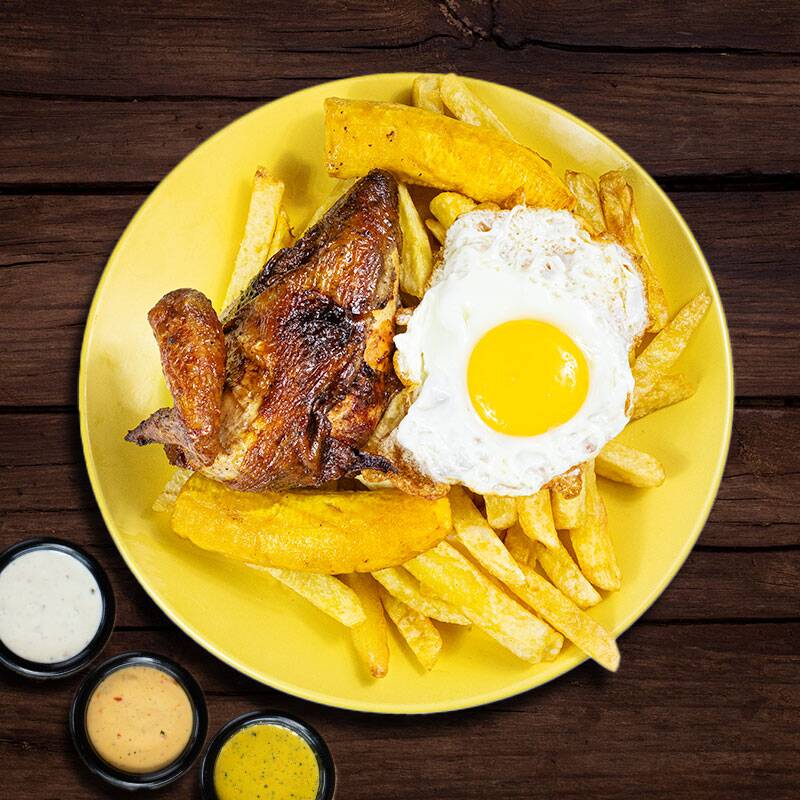 Nuestro tradicional 1/4 de pollo con papas fritas, acompañado de huevo frito y plátano. ¡Bien taypa!