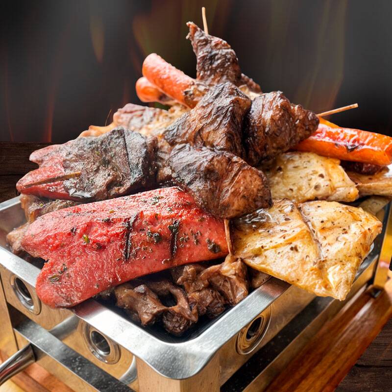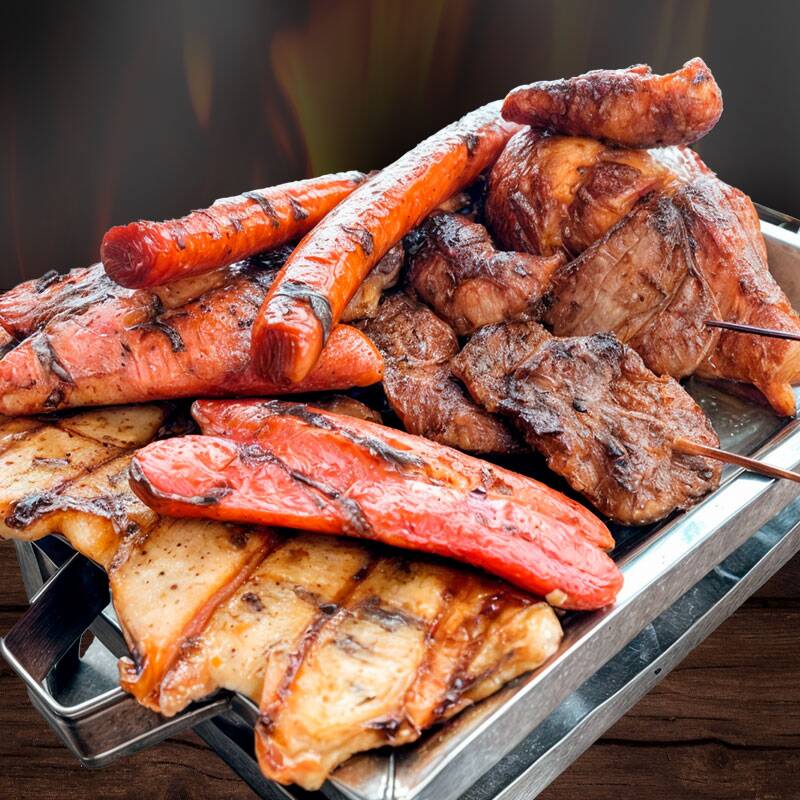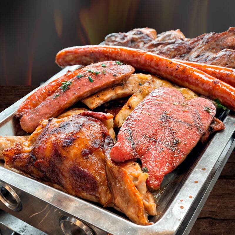 1/2 Pollo a la brasa, churrasco, filete de pierna, pechuga, porción de mollejitas, 2 chorizos, 2 hot dog, 2 palitos de anticucho, chuleta, porción grande de papas fritas y ensalada grande.