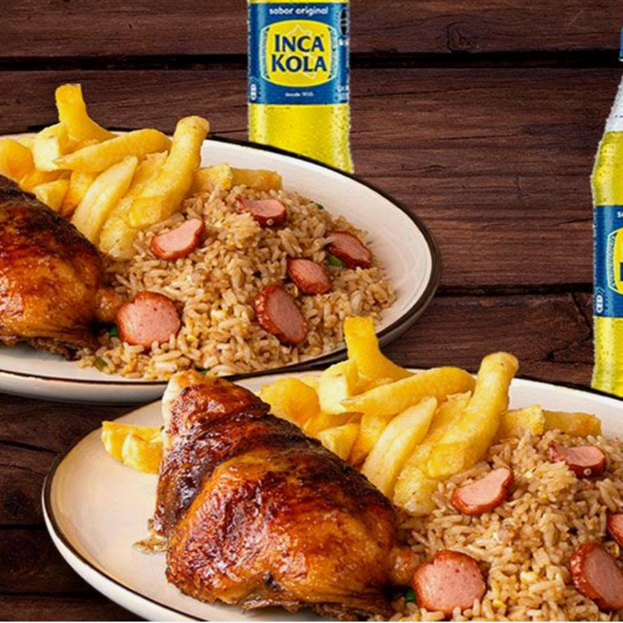 Pollo a la brasa acompañado de papas fritas, ensalada familiar y una gaseosa de 1.5 L.
