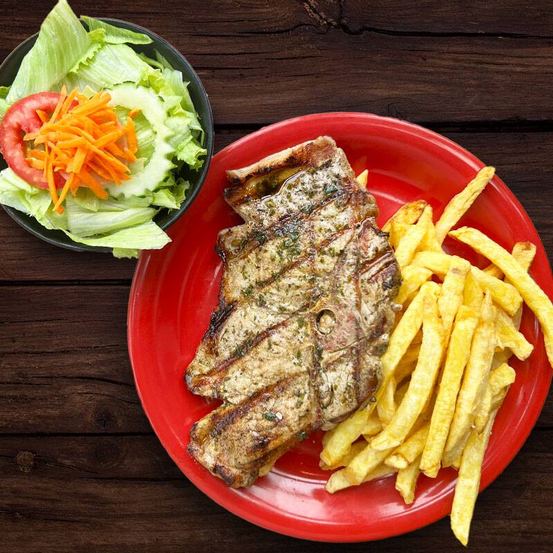 Acompañado de papas fritas y ensalada.