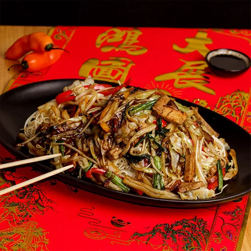 Tallarín chino a base de harina con verduras chinas de temporada y pollo salteado al wok, tamaño familiar.