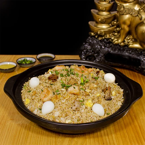 Arroz con pollo, carne, chancho, huevo de codorniz, langostinos fritos, sillao, cebolla china y huevo, tamaño familiar.