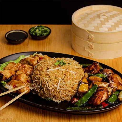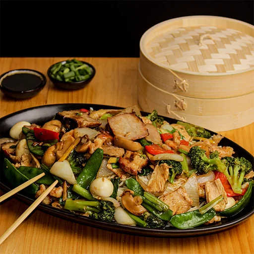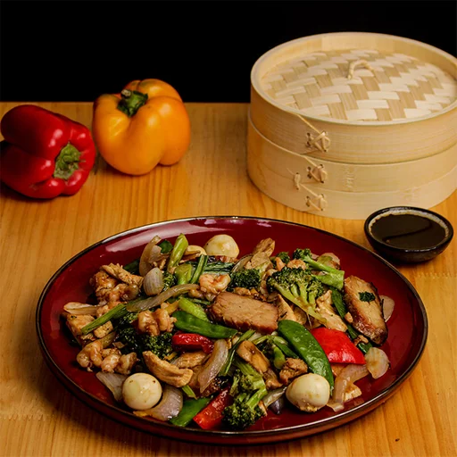 Pollo, chancho, carne, langostino, huevo, pato, salteado al wok, acompañado de verduras chinas de la casa y huevitos de codorniz.