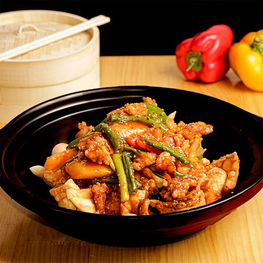 Pollo frito en trozos con verduras chinas de temporada y brócoli.