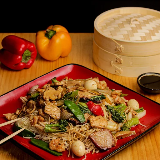 Tallarín chino a base de harina con verduras chinas de temporada, chancho, pollo, langostino, carne de res y huevo de codorniz salteado en el wok.
