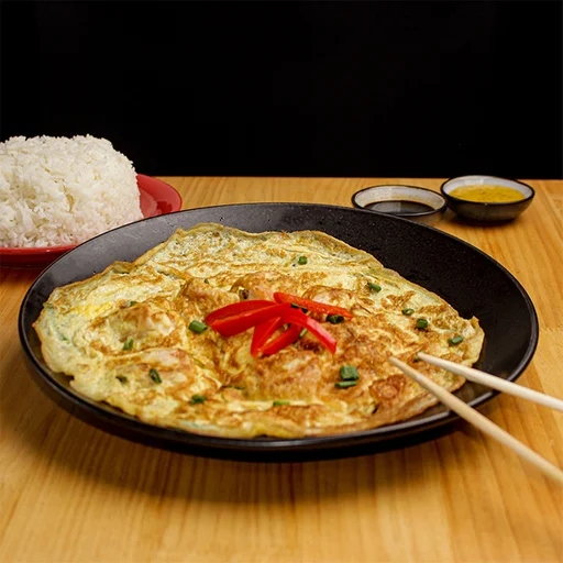 Huevo batido con langostinos fritos, acompañado con arroz blanco