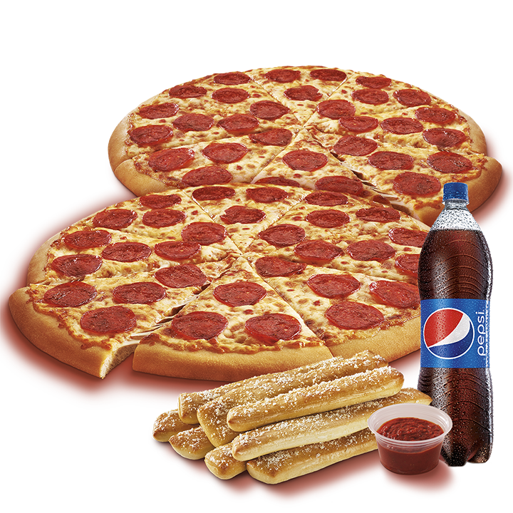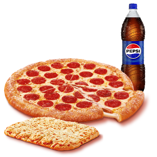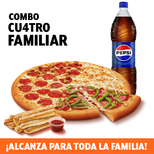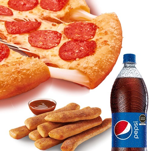 Pizza Familiar 36cm, 2 rebanas de pepperoni, 2 de queso, 2 de salchicha con pepperoni y 2 pimientos verdes con jamón + 8 palitos gigantes bañados en mantequilla de ajo y espolvoreado con queso parmesano + pepsi 1.5L.