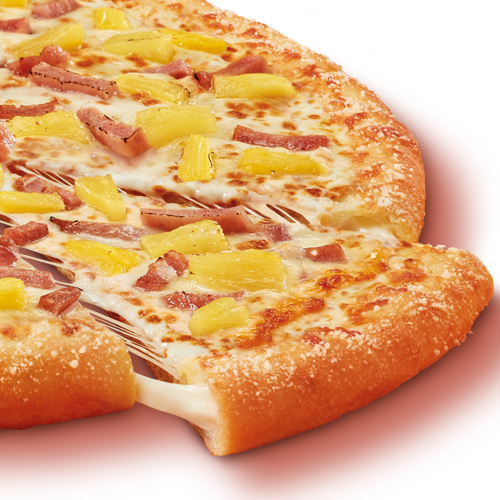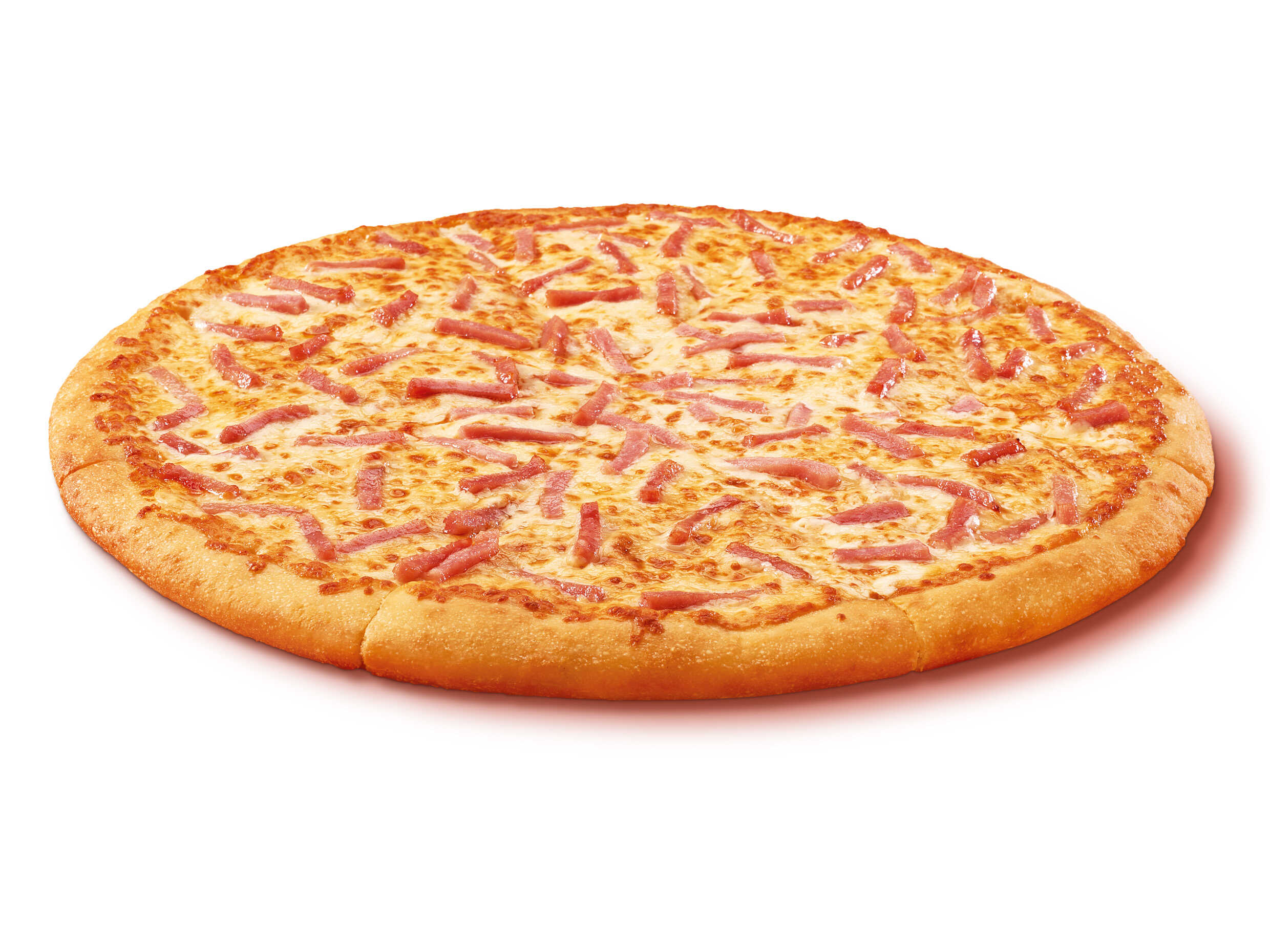 Pizza familiar 36 cm, salsa de tomates, cubierta de quesos 100% mozzarella y cortes de jamón.