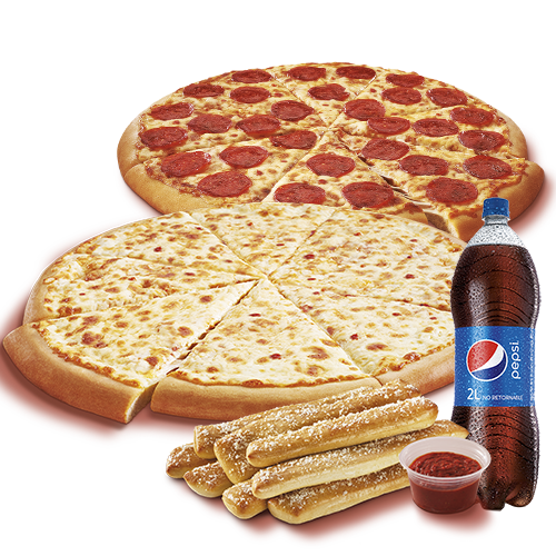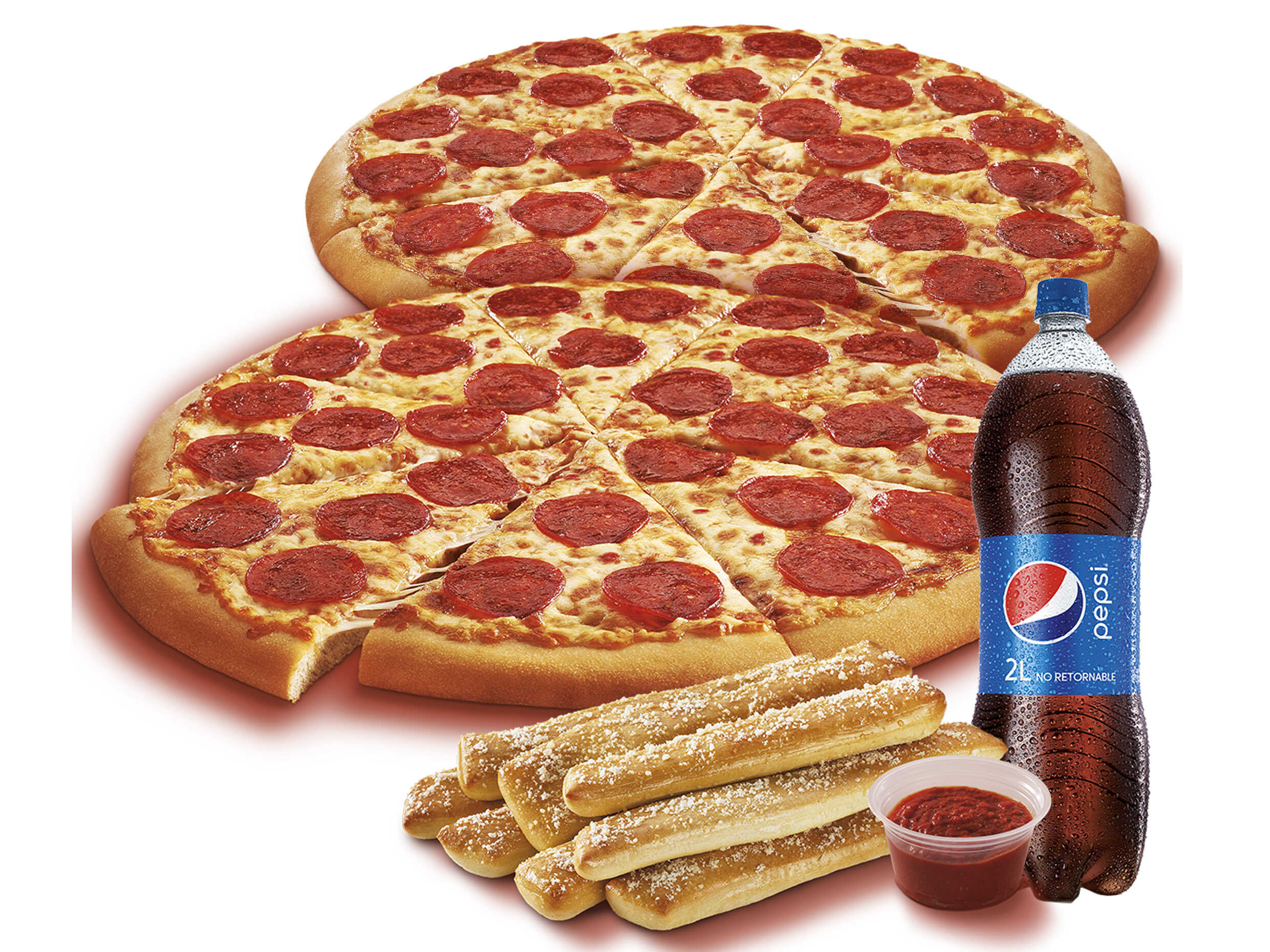 2 Pizzas familiares 36cm 1pizza pepperoni y 1 de queso, crazy bread, crazy sauce, bebida pepsi original 2 L.