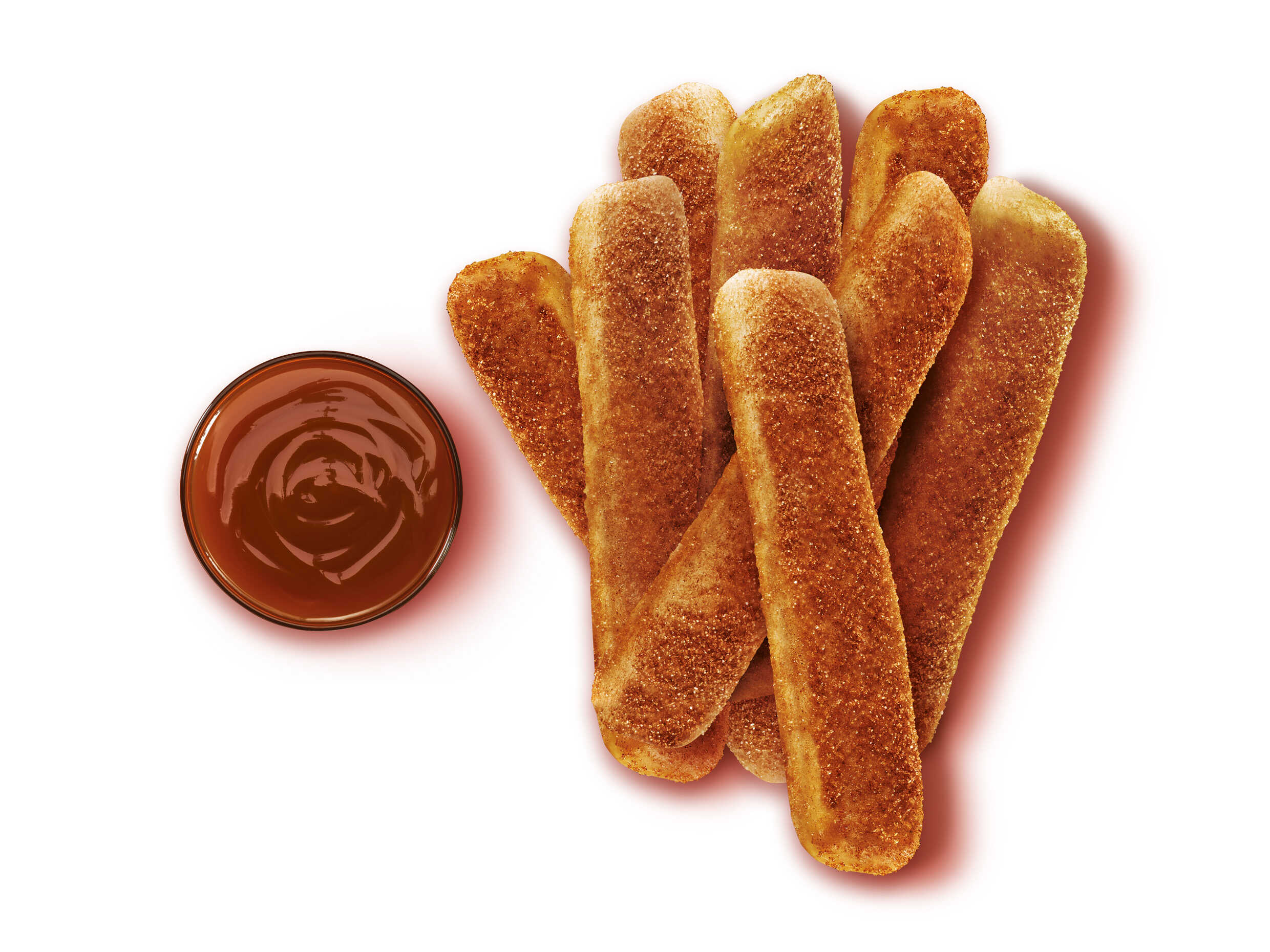 8 Palitos de pan recien horneados cubirtos con mantequilla, azúcar y canela + dip de dulce de leche.