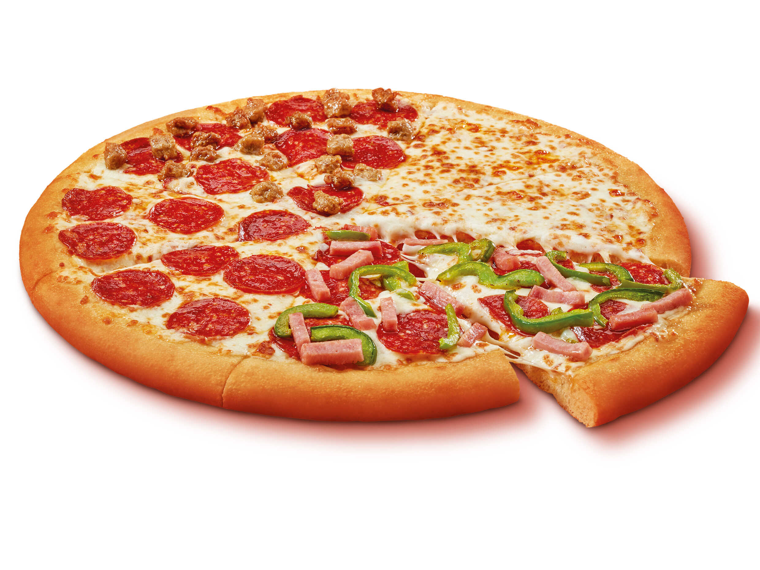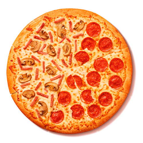 Creamy 2N1 está hecha con un base cremosa de salsa blanca, mitad pepperoni y mitad jamón con champiñones.