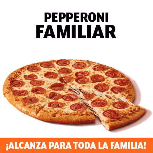 Pizza familiar 36 cm, salsa de tomates, cubierta de quesos 100% mozzarella y pepperoni.