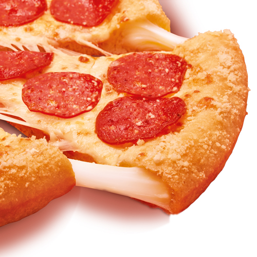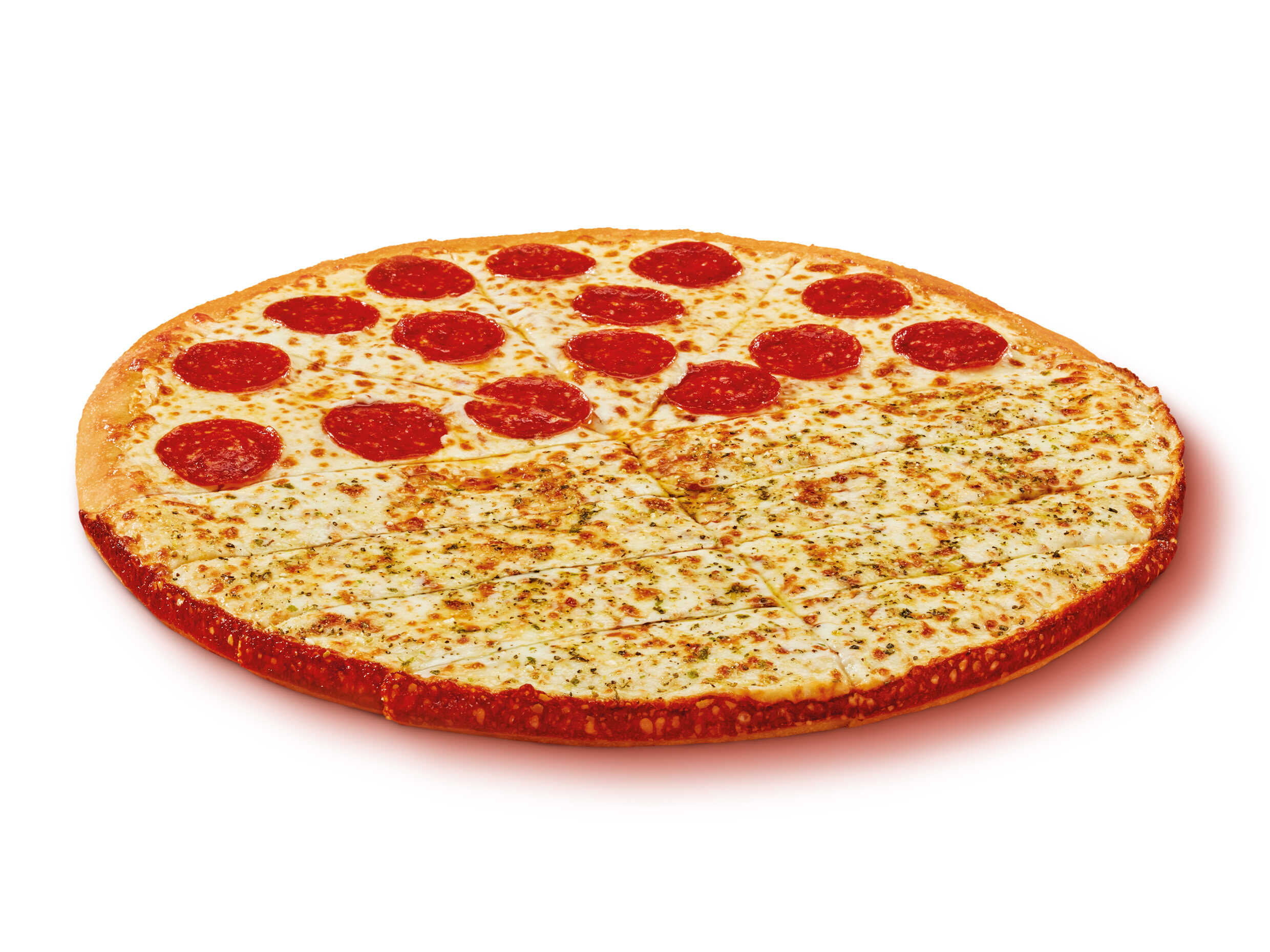 Pizza familiar de 36cm, salsa de tomates, cubierta de quesos 100% mozzarella y pepperoni + 12 palitos de pan cubiertos con 3 quesos.