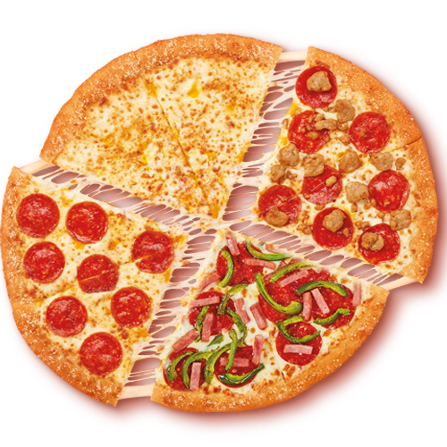 Pizza familiar 36 cm, con 2 rebanadas de pepperoni, 2 de queso, 2 de salchicha con pepperoni y 2 de pimientos verdes con jamón.