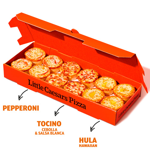 4 Crazy Puffs Pepperoni, 4 Crazy Puffs de Hula Hawaian y 4 Crazy Puffs de salsa blanca, tocino y cebolla.