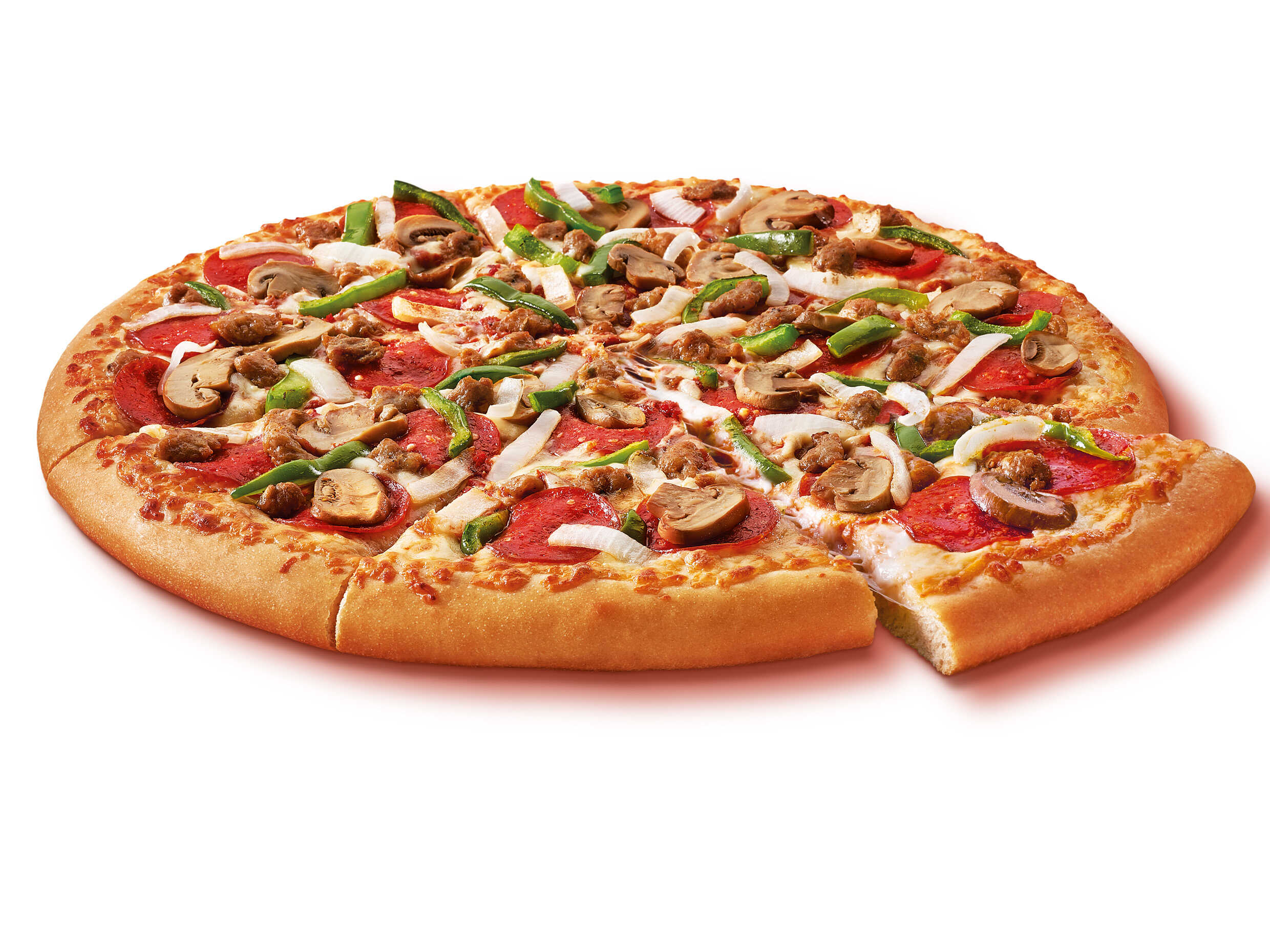Pizza familiar 36 cm, salsa de tomates, queso, pepperoni, salchicha italiana, champiñones, cebolla y pimientos verdes.