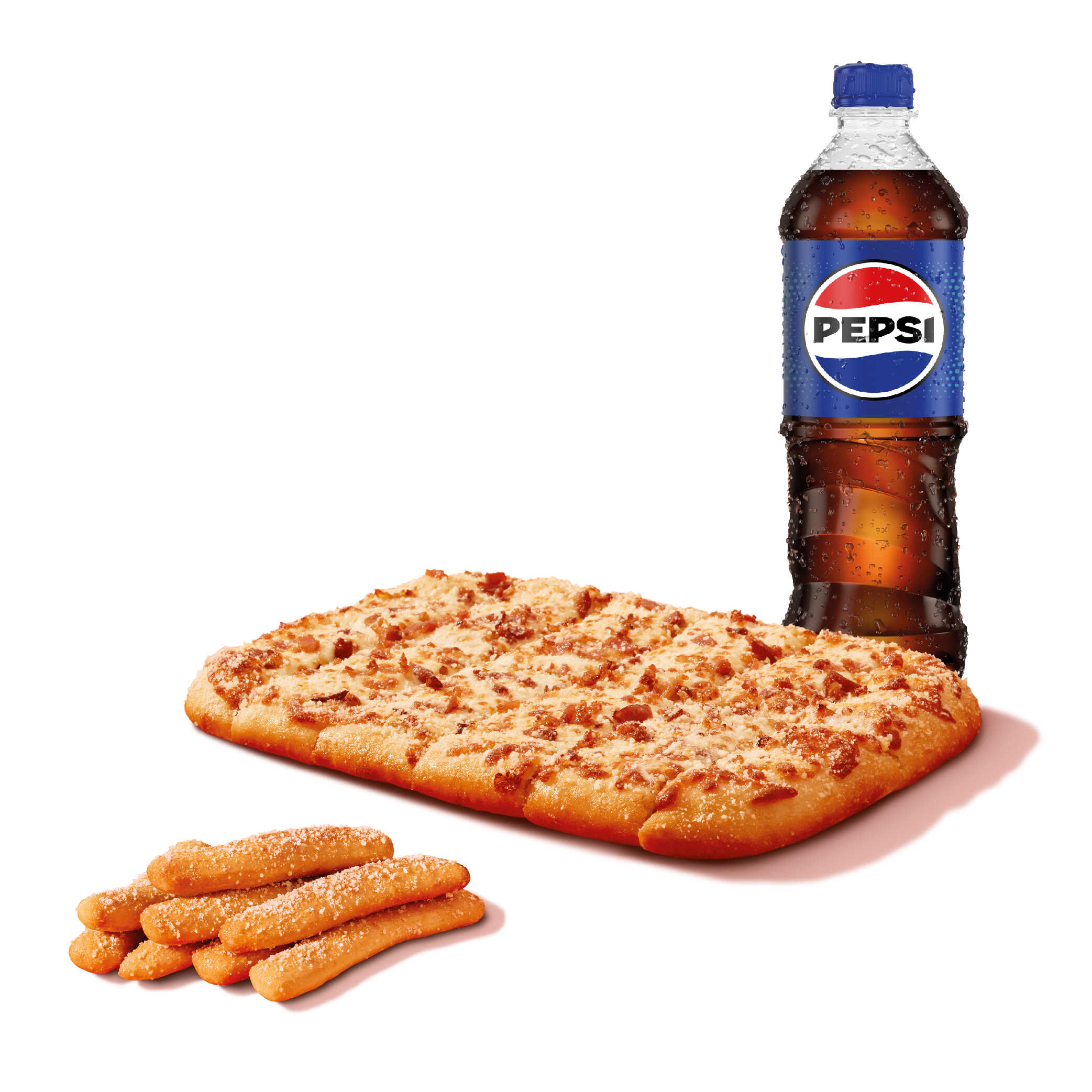 12 Palitos de pan cubiertos (3 quesos, 3 quesos y bacon o 3 quesos y pepperoni) + Pepsi 600 ml + Canelitas o Crazy Bread.
