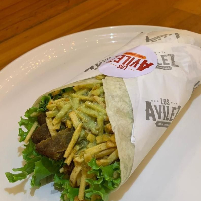 Tortilla de maíz con asado de res, mayonesa, acompañado de ensalada de zanahoria, lechuga, vinagreta y papas al hilo.