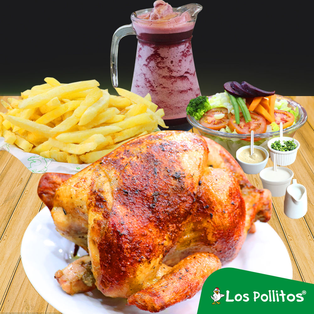 1 Pollo a la brasa con papas fritas, ensalada, chicha morada o limonada de 1 L y cremas a elección.