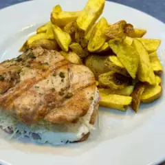Pechuga a la parrilla, acompañado de papas fritas y ensalada.