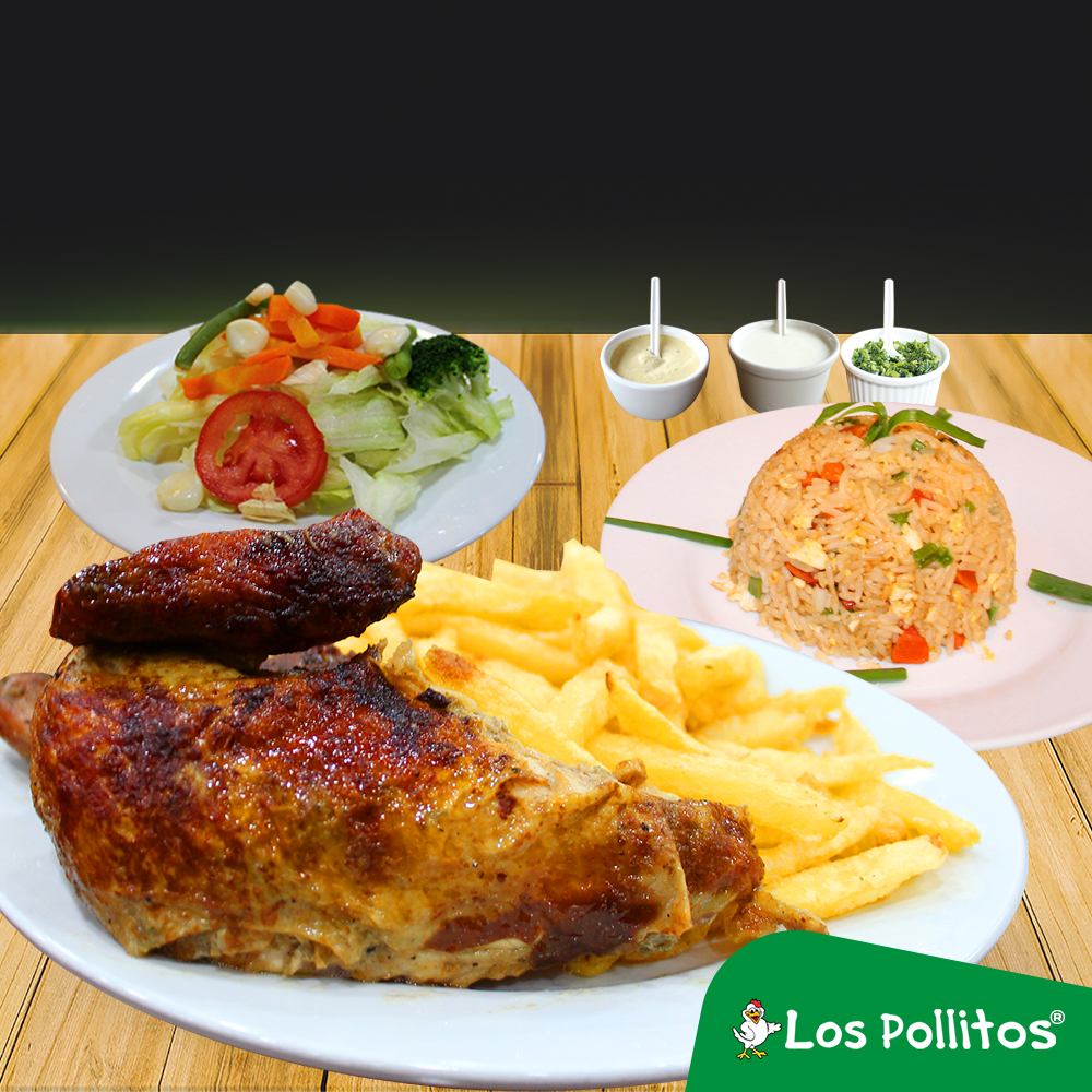 1/4 De pollo a la brasa con arroz chaufa, papas fritas, ensalada y cremas a elección.