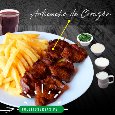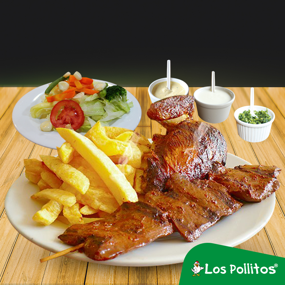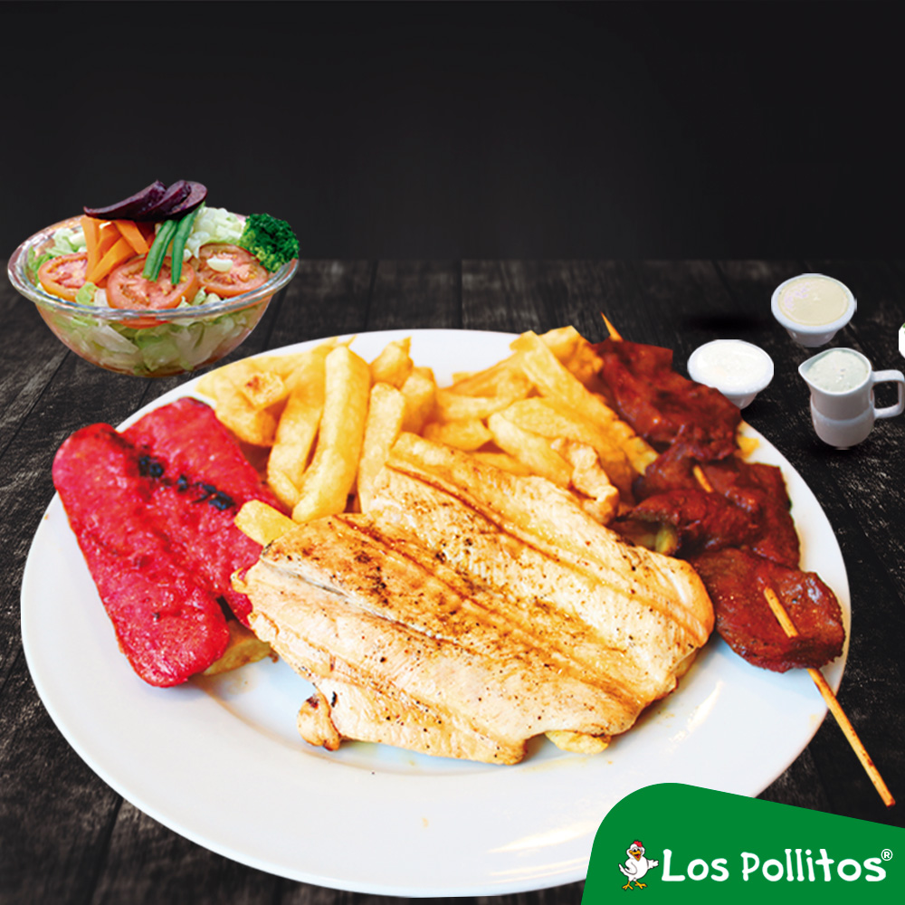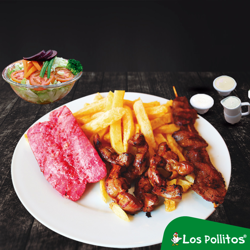 Deliciosa parrilla de churrasco con pechuga, anticucho de res, chorizos, 2 hot dogs, mollejitas, 1/4 de pollo, gaseosa de 1.5 L o jarra de chicha de 1 L, acompañado con papas fritas y ensalada.