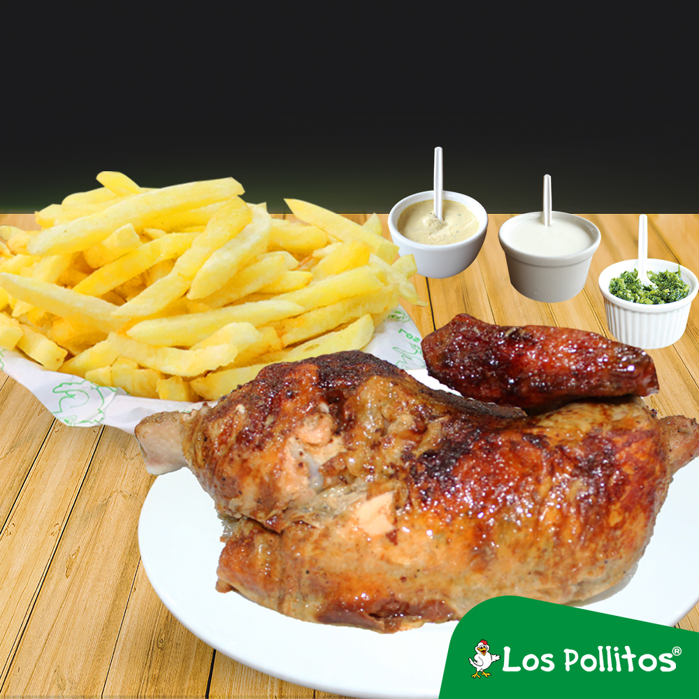 1/4 de Pollo a la Brasa con Papas Fritas más cremas a elección. Sin ensalada.