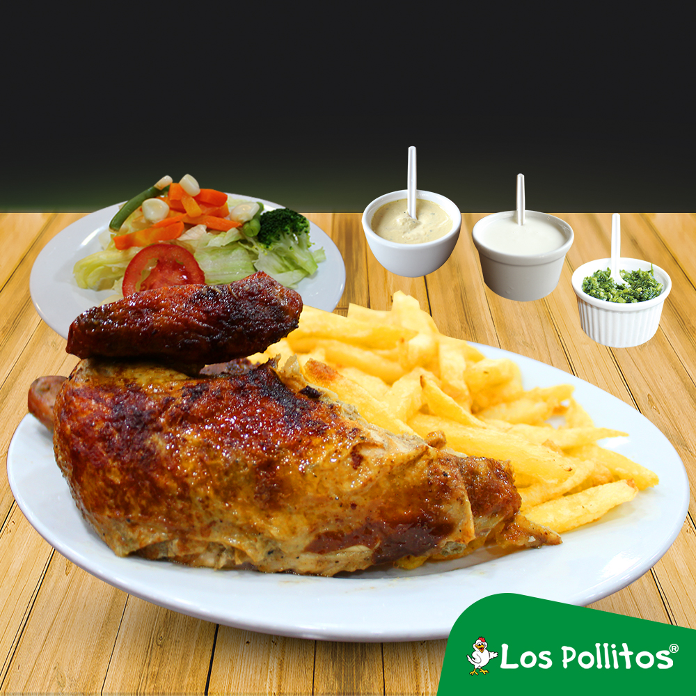 1 Pollo más 1/2 pollo a la brasa con papas fritas, ensalada y cremas a elección.