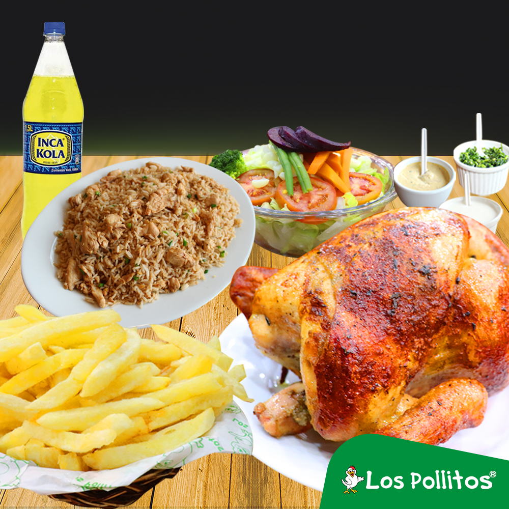 1 Pollo a la brasa con papas fritas, gaseosa de 1.5 L, arroz chaufa, ensalada y cremas a elección.