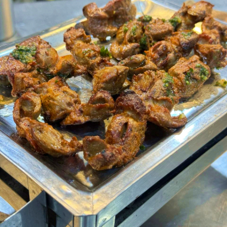 Deliciosa parrilla de chuleta con churrasco, pechuga, 2 anticuchos de res, 1 anticucho de pollo, 2 chorizos, brochetas, mollejitas, jarra de chicha de 1 L, acompañado con papas fritas, ensalada y vino Santiago Queirolo.
