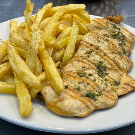 Pechuga a la parrilla, acompañado de papas fritas y ensalada.