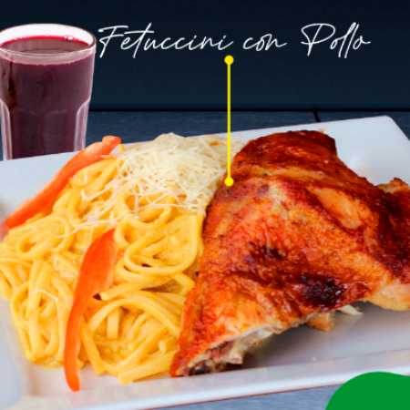 Pasta en una salsa al pesto con espinaca, albahaca y queso, acompañado de un delicioso 1/4 de pollo más salsa huancaína.