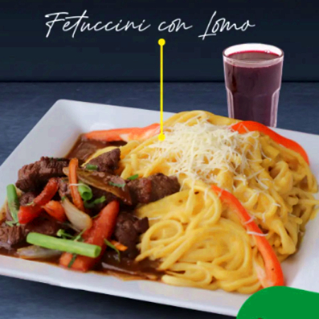Pasta en una salsa al pesto con espinaca, albahaca y queso, acompañado de un jugoso lomo saltado más salsa huancaína.