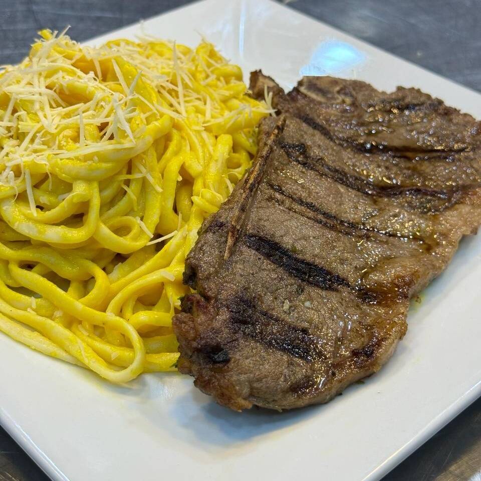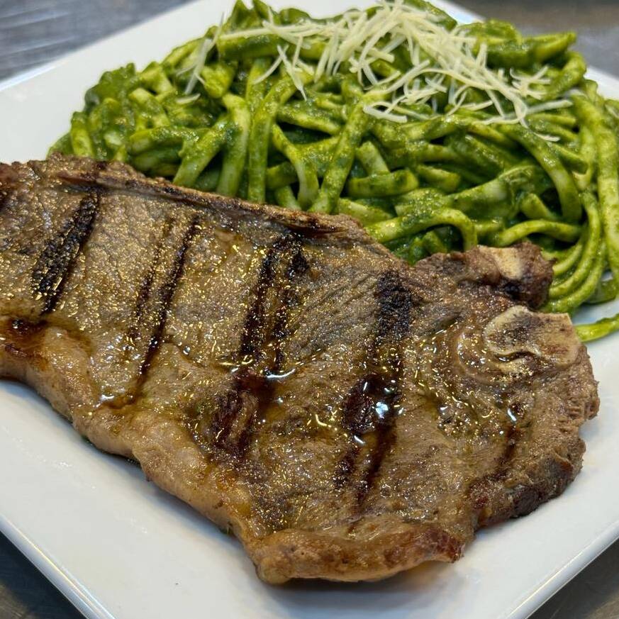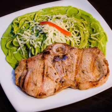 Pasta en una salsa al pesto con espinaca, albahaca y queso, acompañado de un jugoso churrasco.