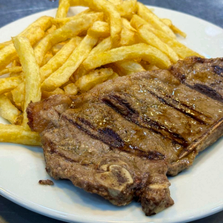 Churrasco acompañado de papas fritas y ensalada.