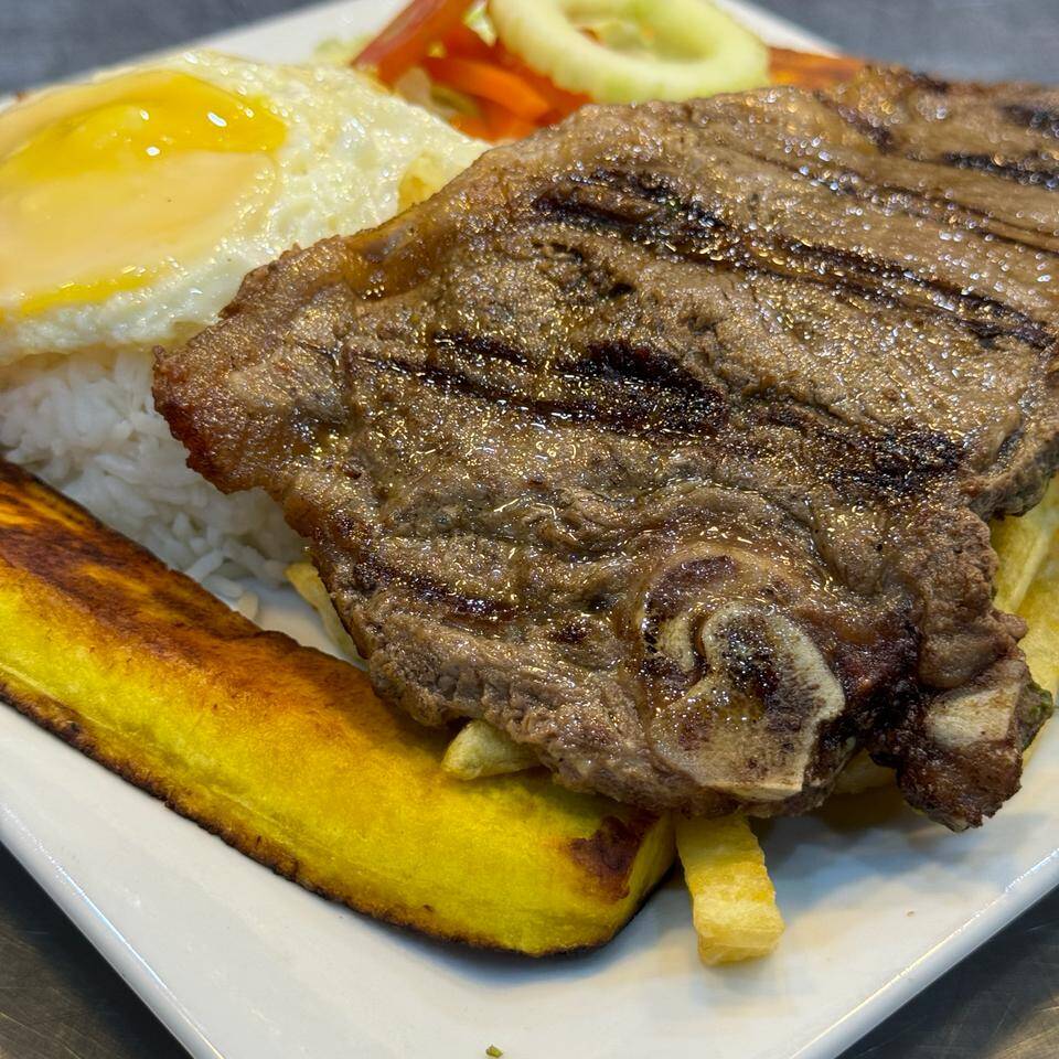 Delicioso bistec de res con arroz blanco, plátano frito, huevo frito y papas fritas.