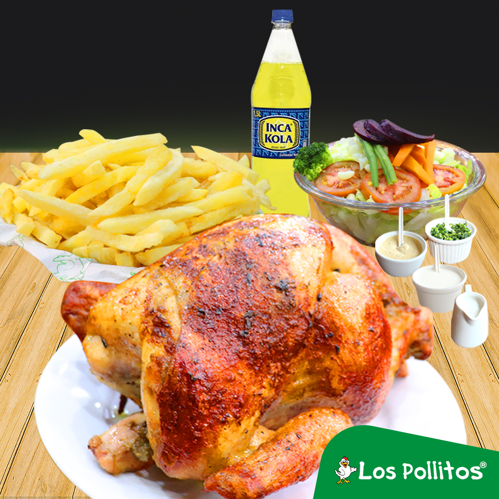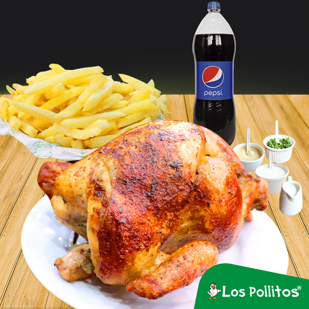 1 Pollo a la brasa con papas fritas, ensalada, gaseosa Pepsi 2 L y cremas a elección.