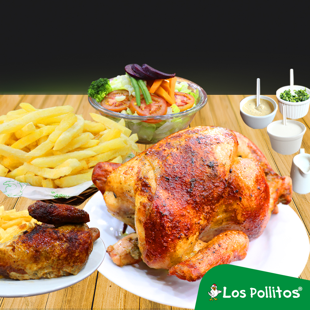 1 Pollo más 1/2 pollo a la brasa con papas fritas, ensalada y cremas a elección.