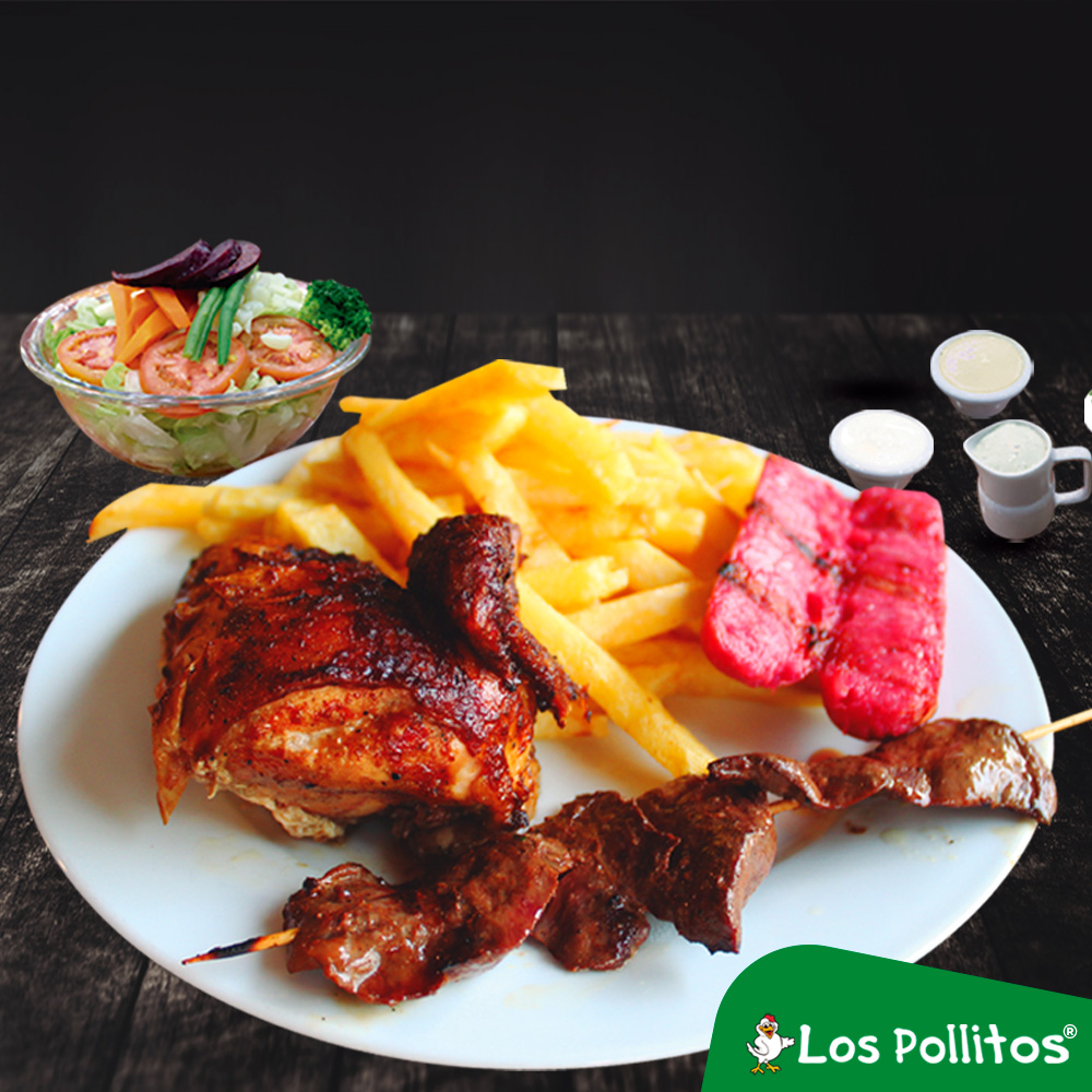1/4 de Pollo con papas fritas, ensalada, anticucho de res y chorizo