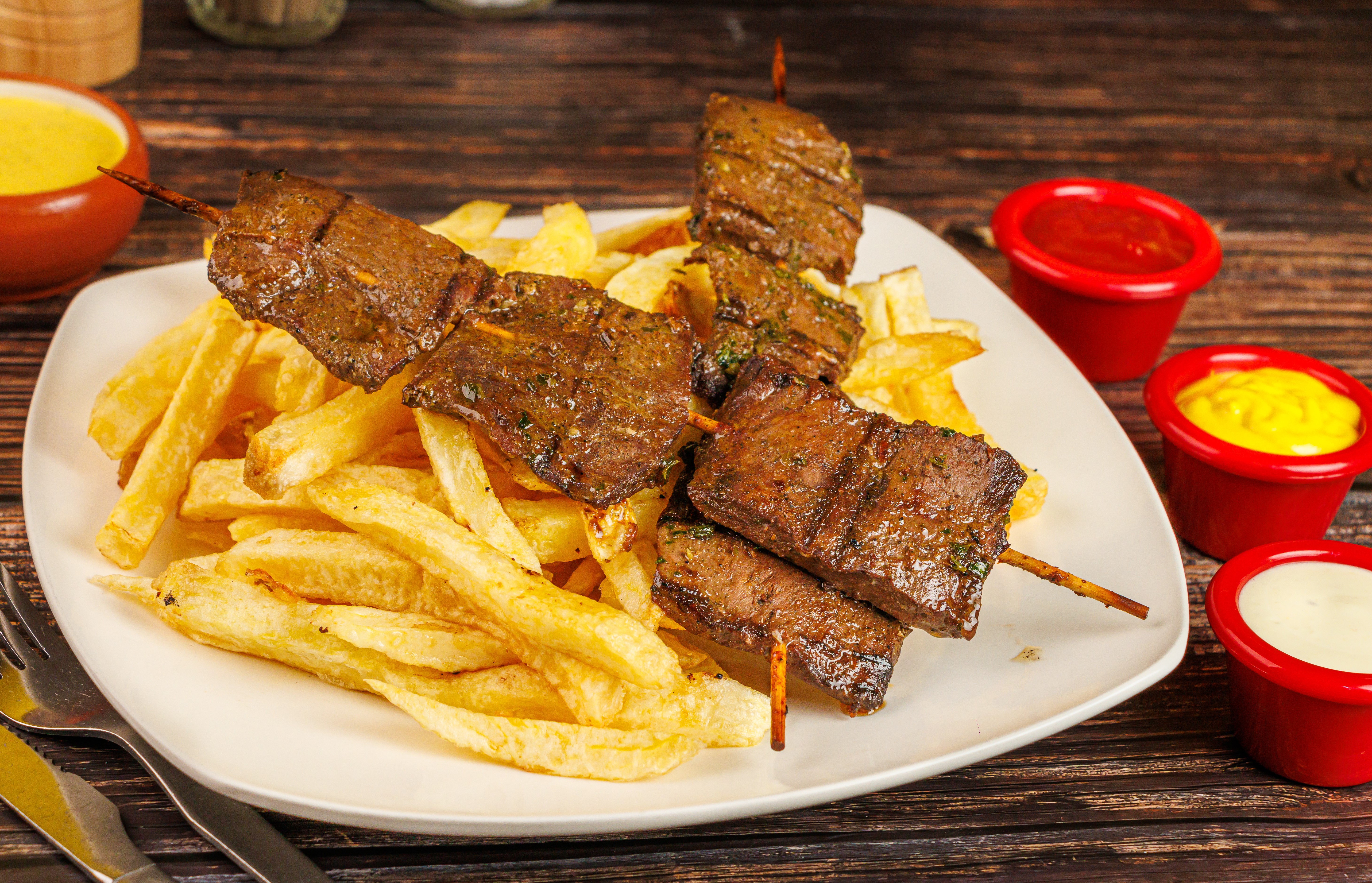 2 Palitos de anticuchos, papas, cremas y ensalada.