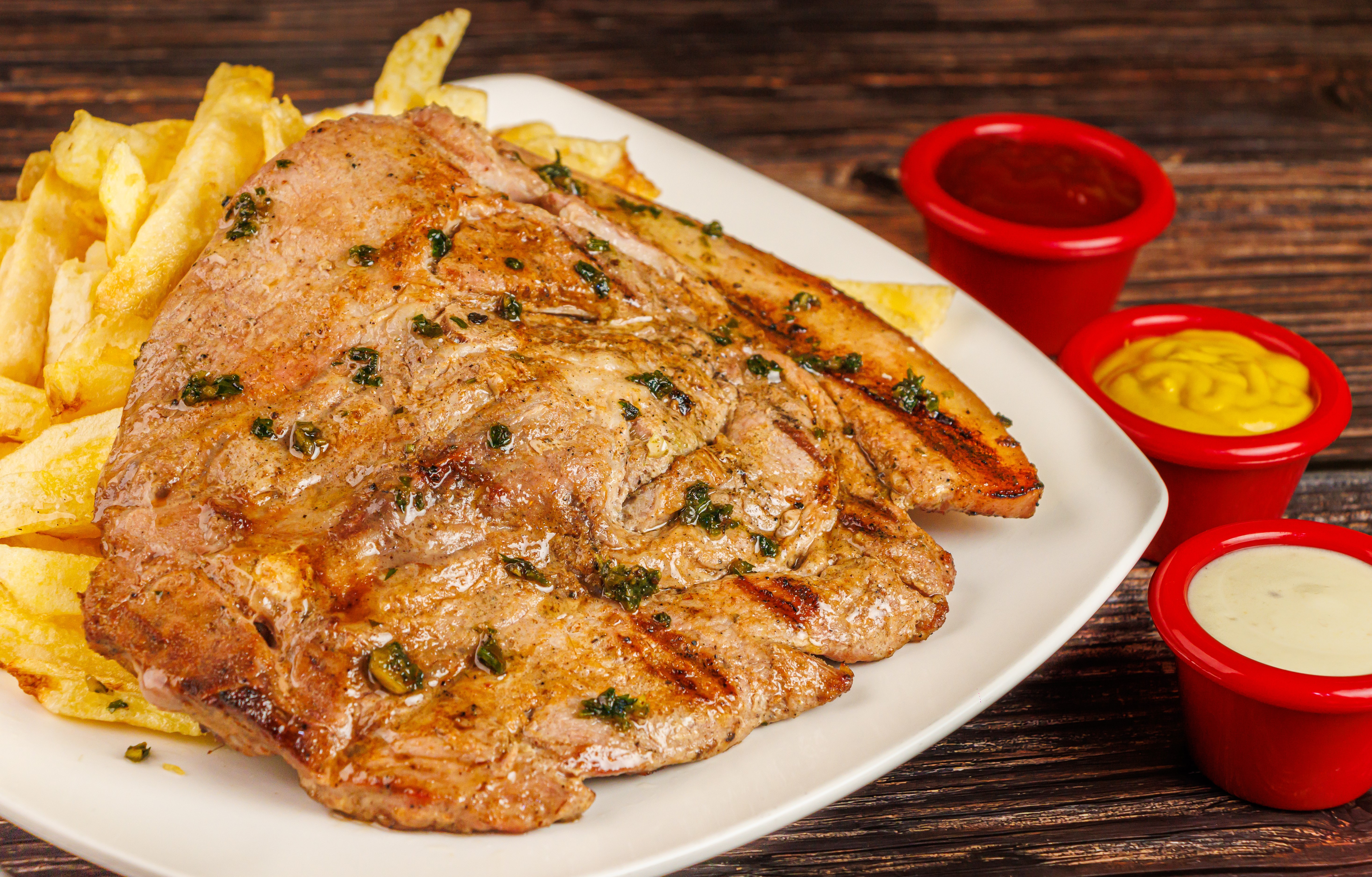 Churrasco 200 gramos, papas, cremas y ensalada.