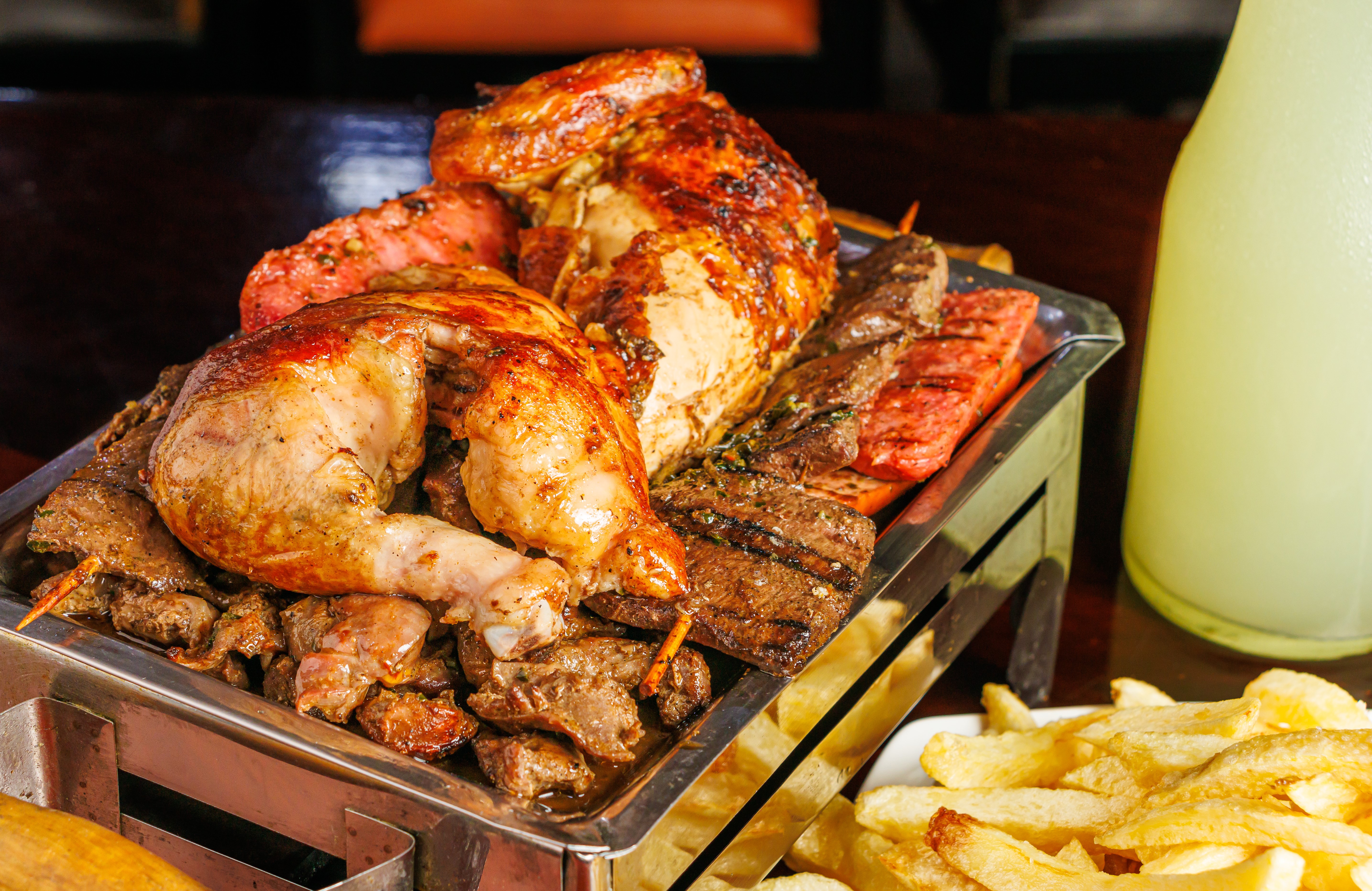 1/2 pollo + 1 churrasco + 1 chuleta + 1 palito de anticucho + 1 frankfurter+ 1 chorizo + papas + 1 limonada