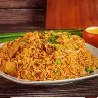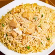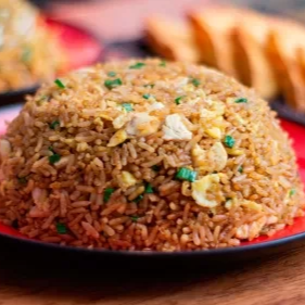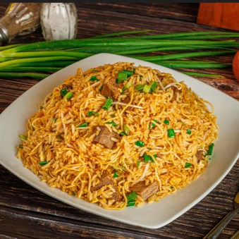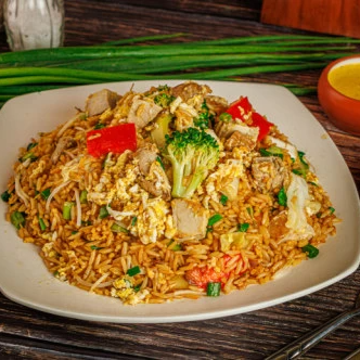 Arroz chaufa de pollo, cebollita fina y huevo.